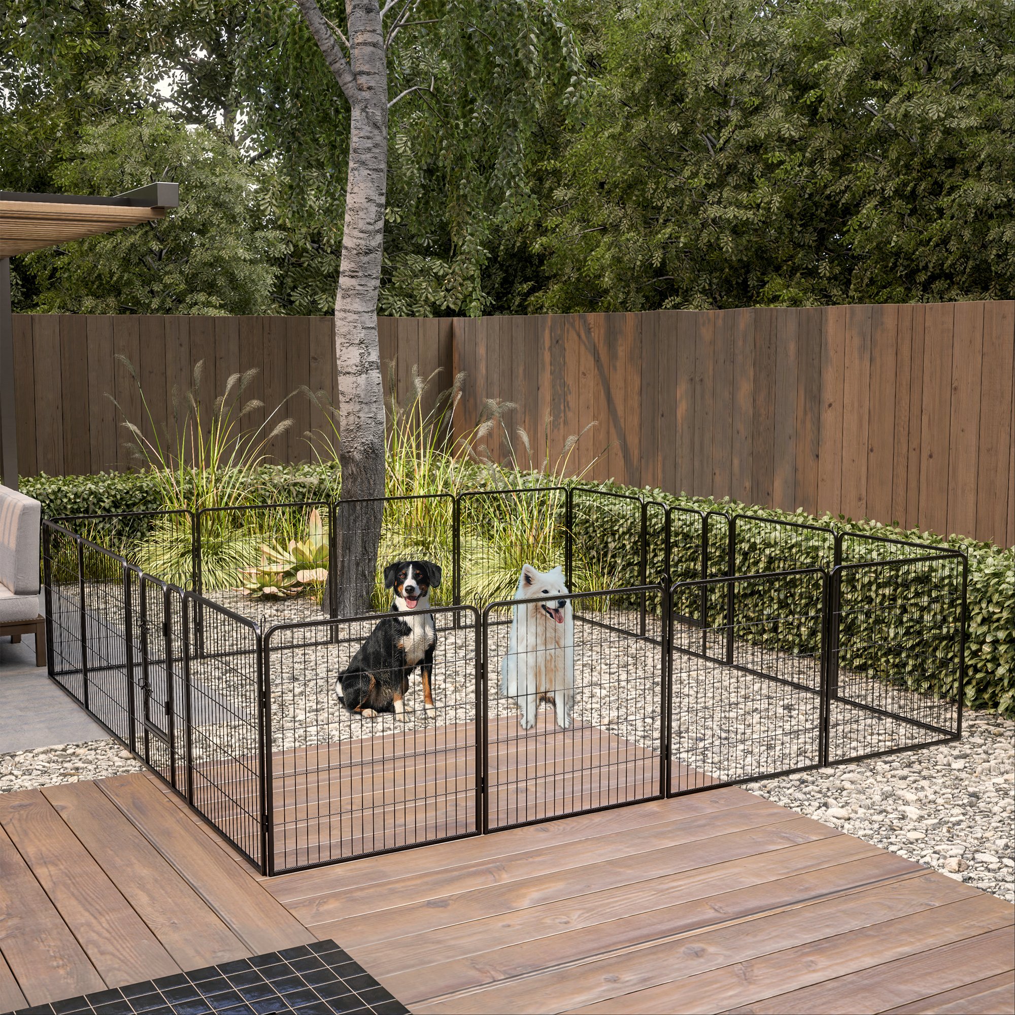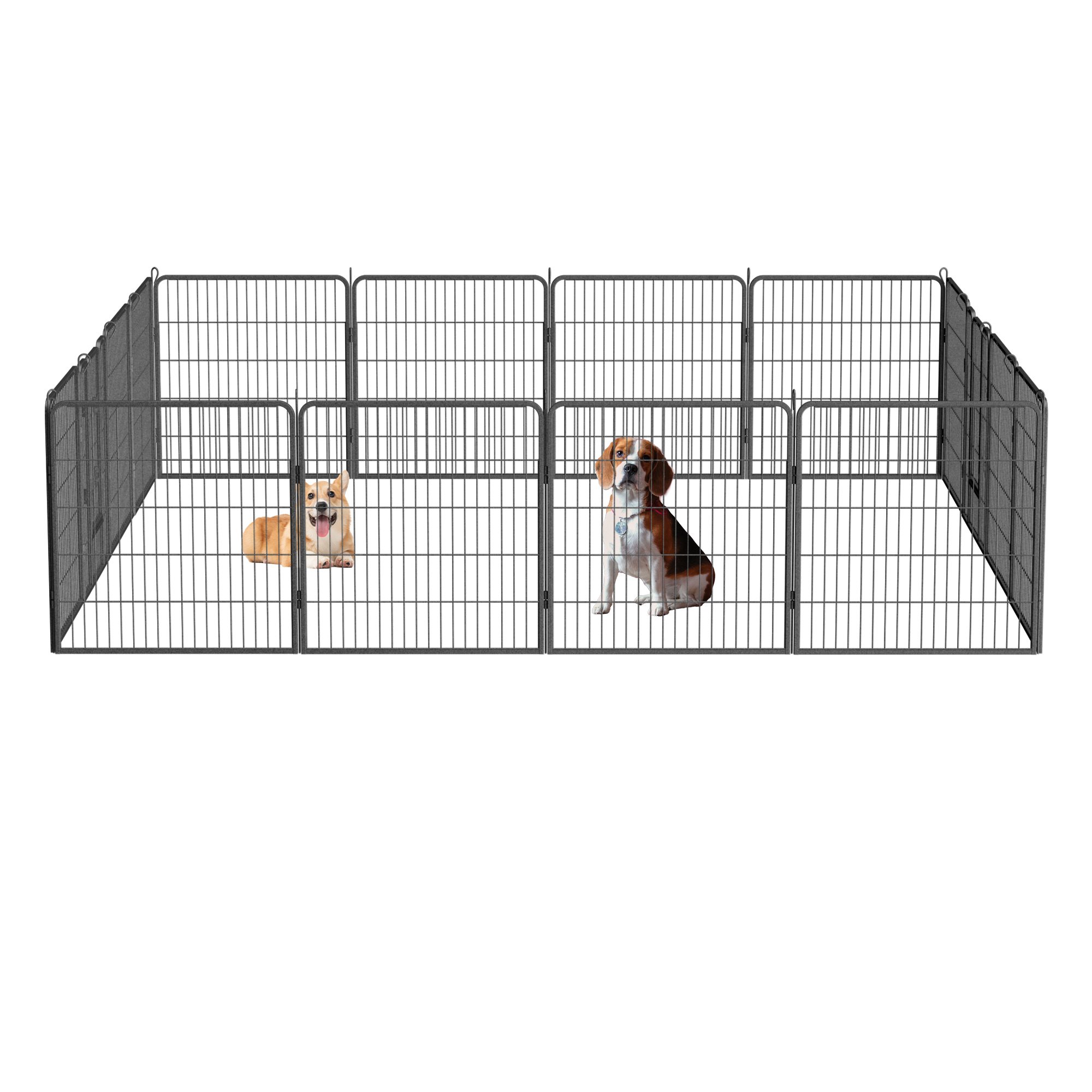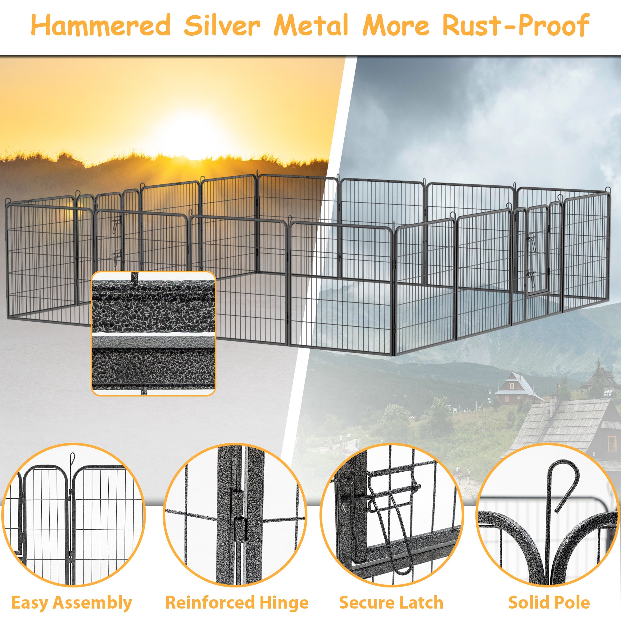 1.[Durable & Premium Material] The dog playpen for large dogs is made of high quality wrought iron and features double-coated finish that makes it highly rust-resistant and waterproof, ideal for RV camping, traveling, or use in the yard. The dog fence with protective pads on each panel and flat stakes make it suitable to use indoor. Perfect indoor and outdoor dog playpen for resting and playing.