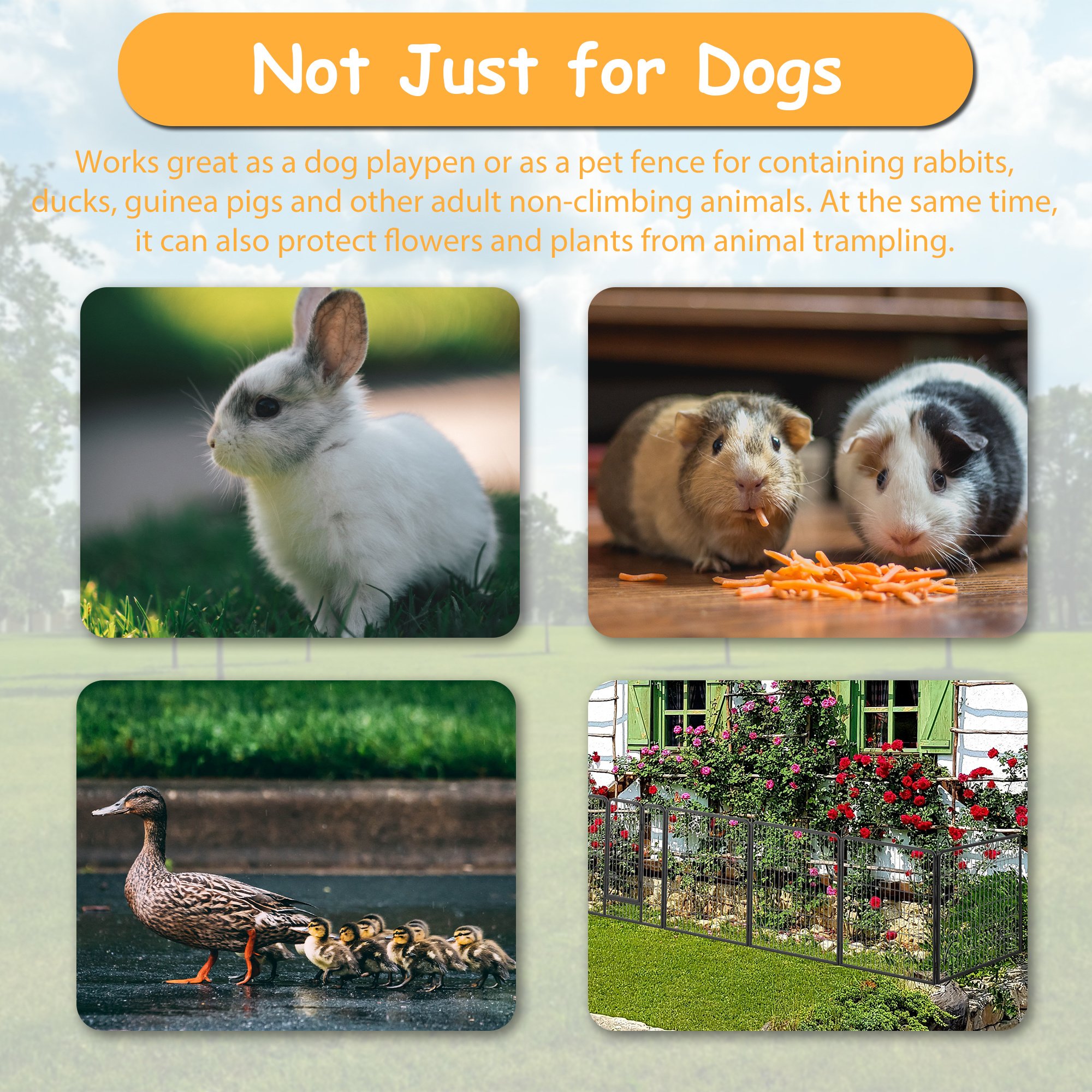 3.[Versatile to Use] It can be used as a kennel, crate, pet hangout and playroom. It's taller 32" height makes it an excellent exercise area for small, medium and large animals including dogs, ducks, rabbits, hedgehogs, hamsters, turtles, guinea pigs etc. They can all have fun in this fence.